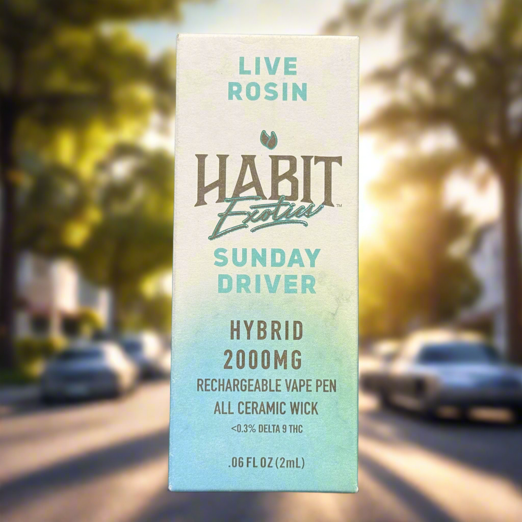Cruise into calm with Habit Exotics β Sunday Driver Hybrid Rechargeable Vape Pen! ππΏ Infused with 2000mg of premium THCA, this hybrid pen delivers smooth, balanced effects and a sweet, dessert-like flavor profile with hints of fruity richness. The rechargeable design ensures long-lasting use, while the slim, discreet build makes it perfect for everyday carry. A relaxing yet uplifting option, this pen is ideal for those who want flavor, potency, and convenience in one sleek device.